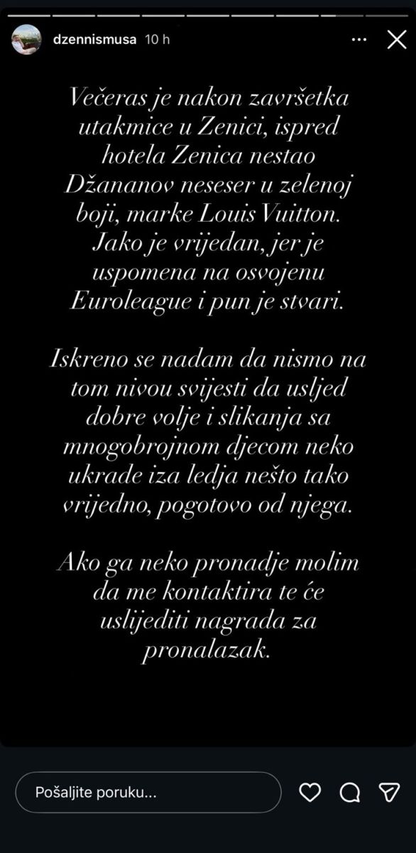 “Večeras je nakon utakmice u Zenici, ispred hotela Zenica, nestao Džananov neseser u zelenoj boji, marke Louis Vuitton. Riječ je o jako vrijednom predmetu, jer nosi posebnu uspomenu na osvojenu Euroligu i ima veliku emotivnu vrijednost.